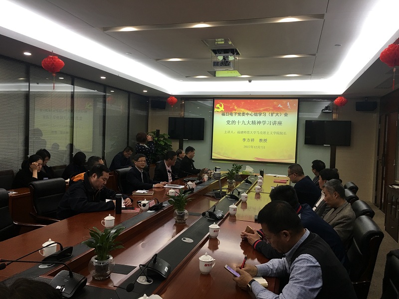2017年12月7日下午,福日電子以黨委中心組學習(擴大)會的形式舉辦黨的十九大精神學習講座,特邀福建師范大學馬克思主義學院院長、博士生導師李方祥教授作了題為《新思想引領(lǐng)新時代,新使命開啟新征程》的十九大精神輔導,公司黨委委員、成員企業(yè)、事業(yè)部副總以上領(lǐng)導、本部助理以上管理人員以及機關(guān)支部全體黨員近40人參會。