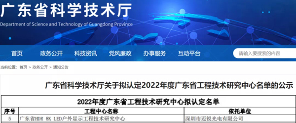 近日,廣東省科學技術廳發(fā)布了《關于擬認定2022年度廣東省工程技術研究中心名單的公示》,經(jīng)專家評審和網(wǎng)上公示,福日電子成員企業(yè)邁銳光電獲2022年度廣東省HDR 8K LED戶外顯示工程技術研究中心資格認定。