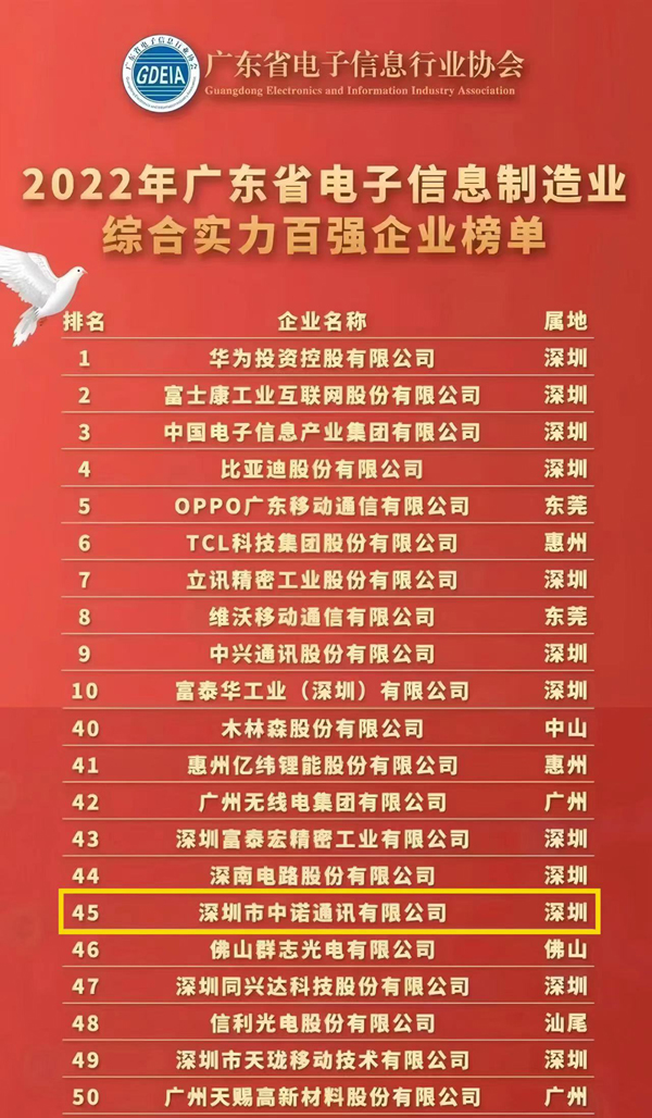中諾通訊繼續入選2022廣東省電子信息制造業綜合實力百強